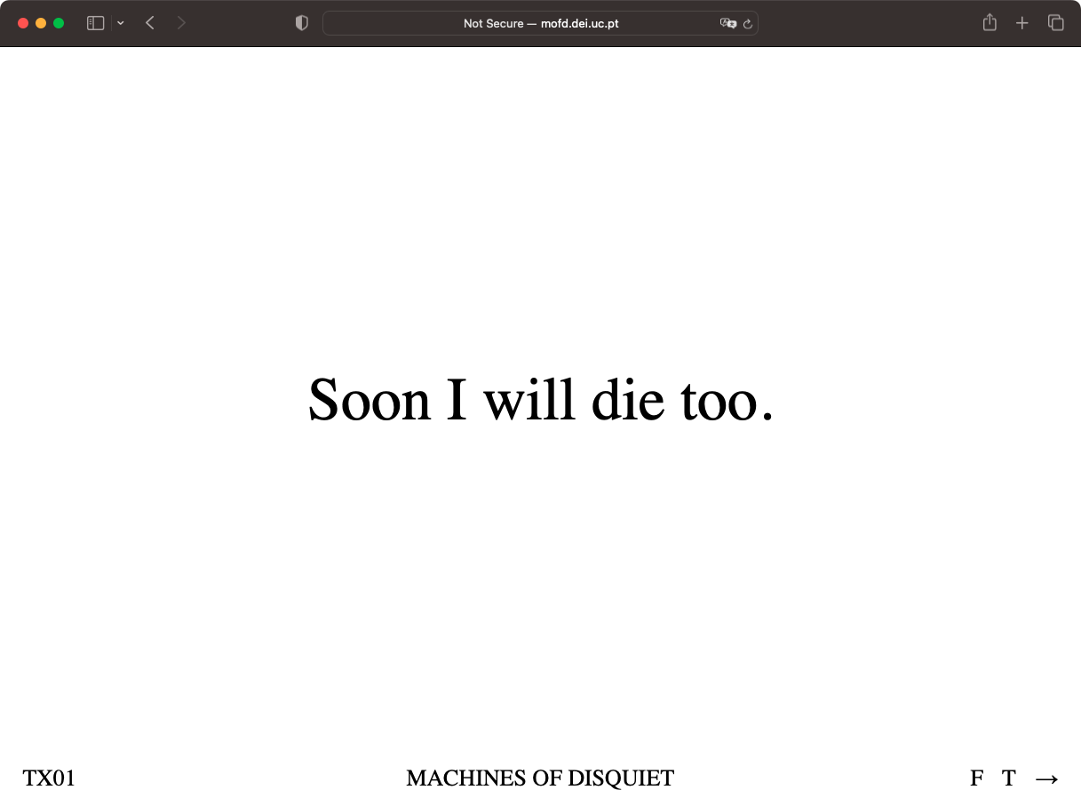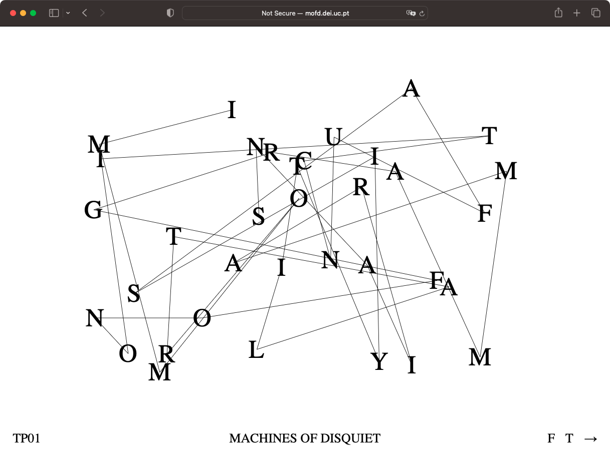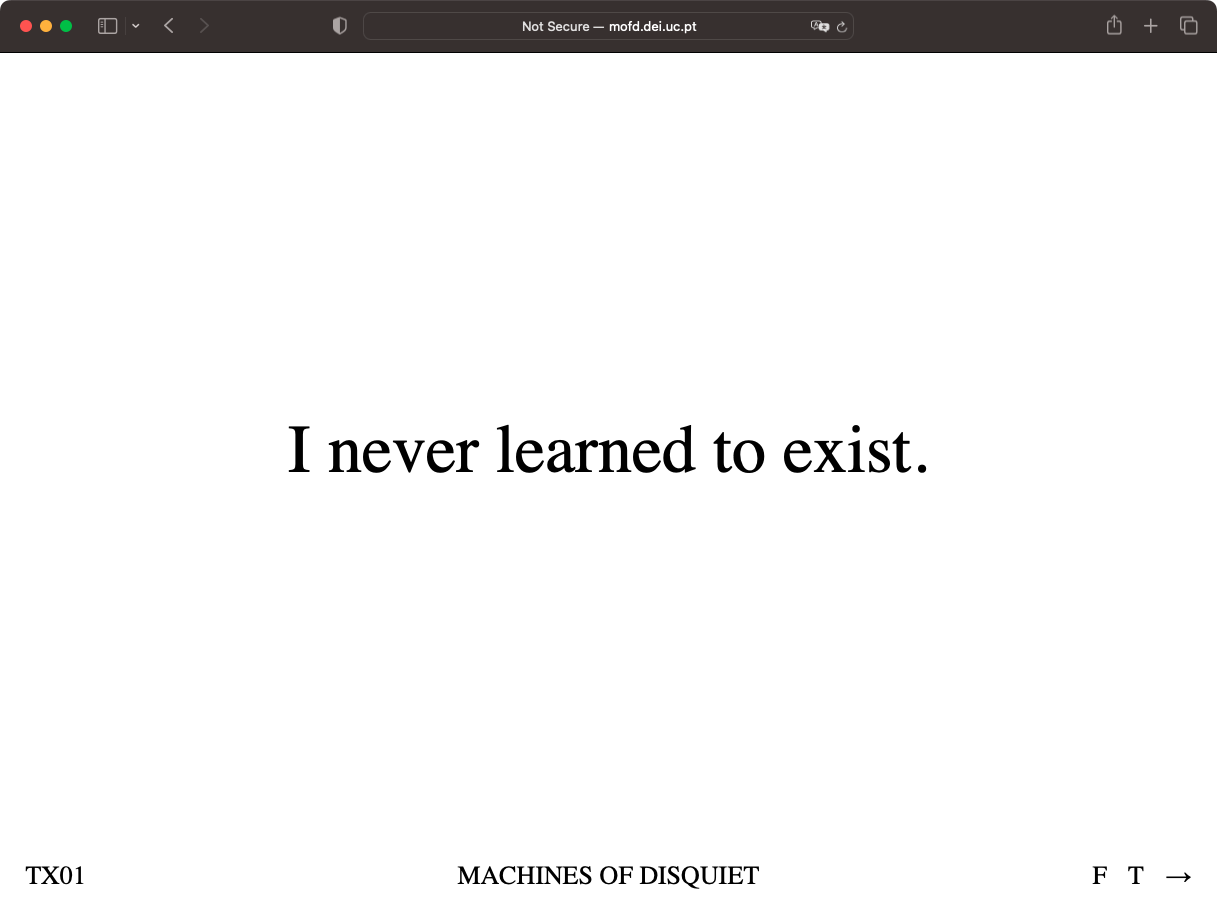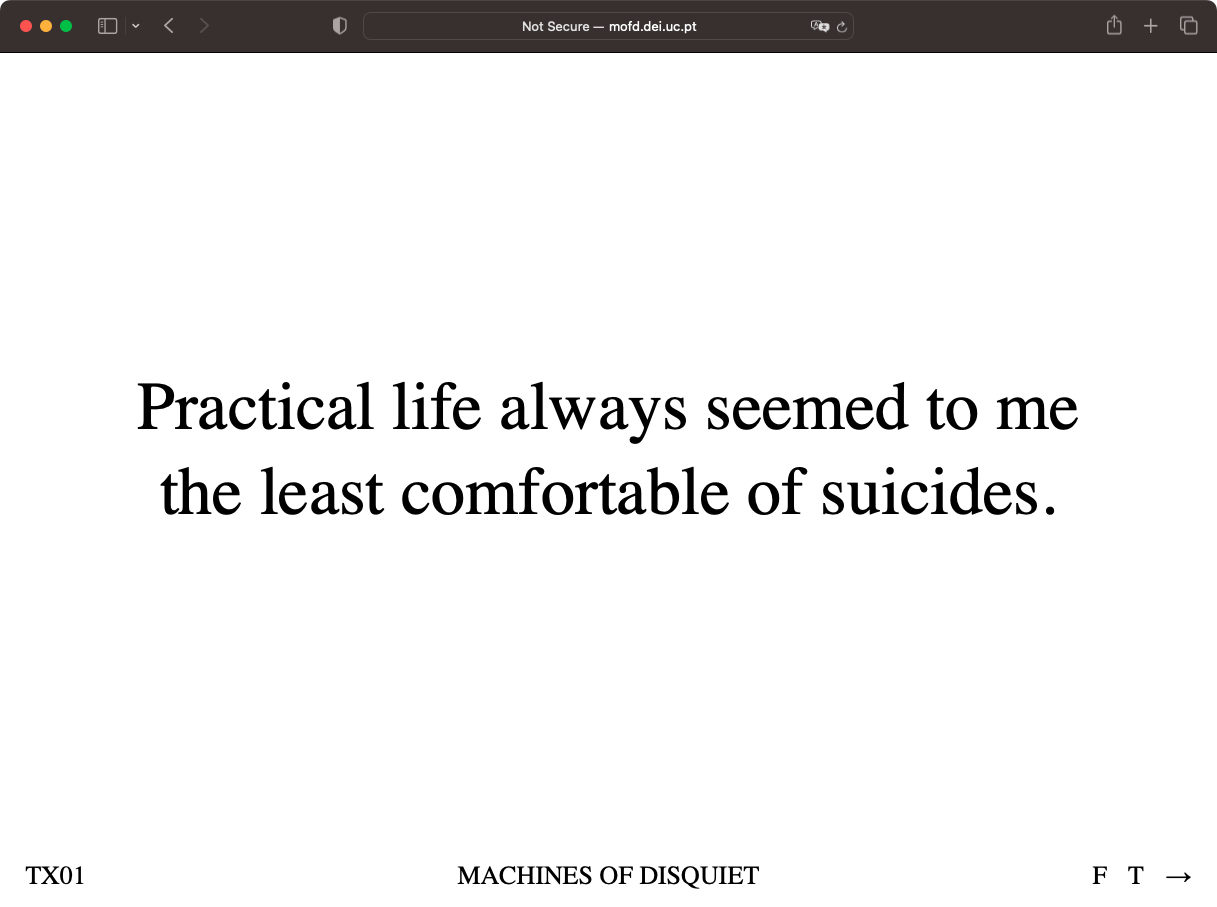 As Máquinas do Desassossego são uma série de experiências interactivas com a manipulação de materialidades mediais e formas textuais que exploram o jogo livre dos significantes. Usam o Livro do Desassossego como base textual modular para desenvolverem uma série de aplicações baseadas em multimodalidades (texto, imagem, som, animação) e interações digitais recorrendo a permutações programadas em diferentes escalas (da letra à palavra e à frase).