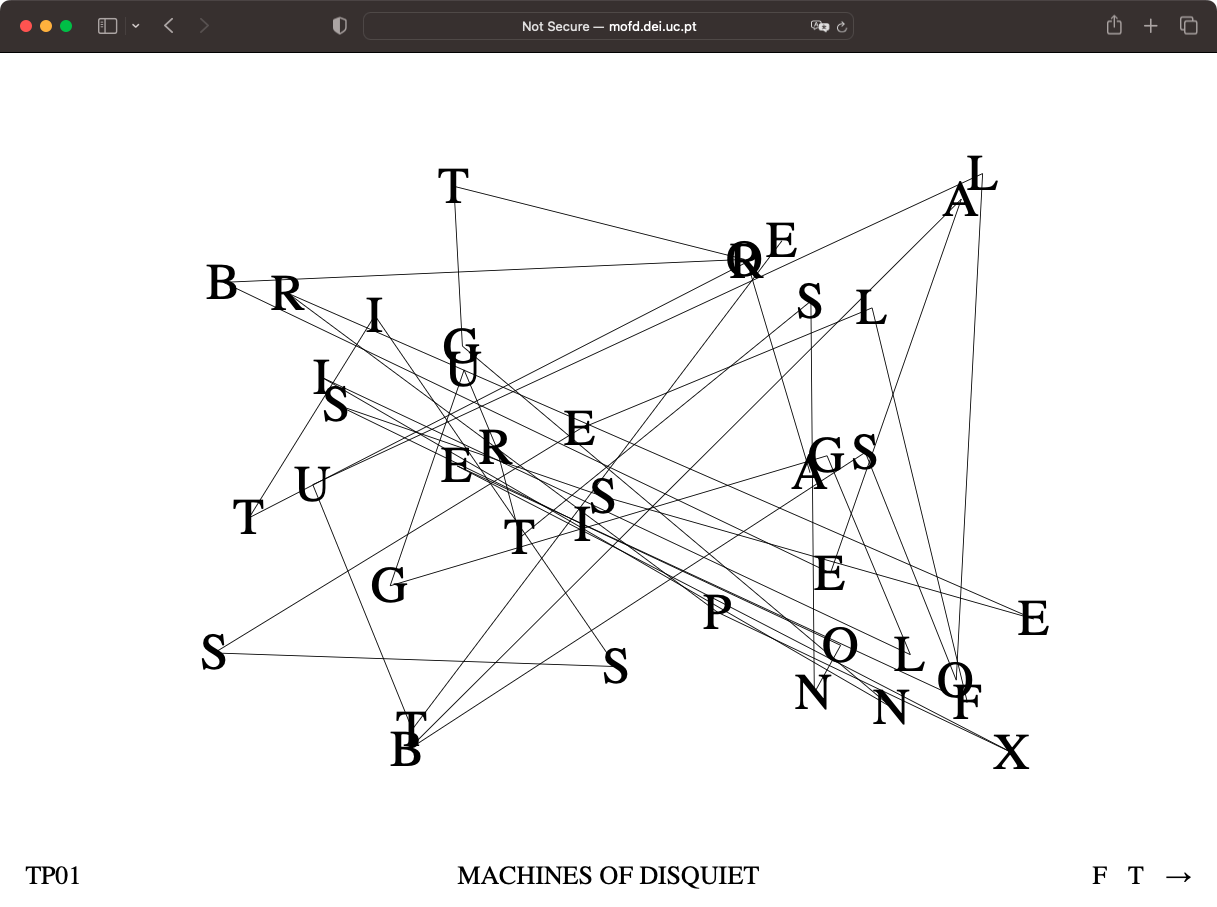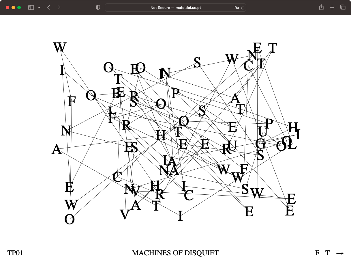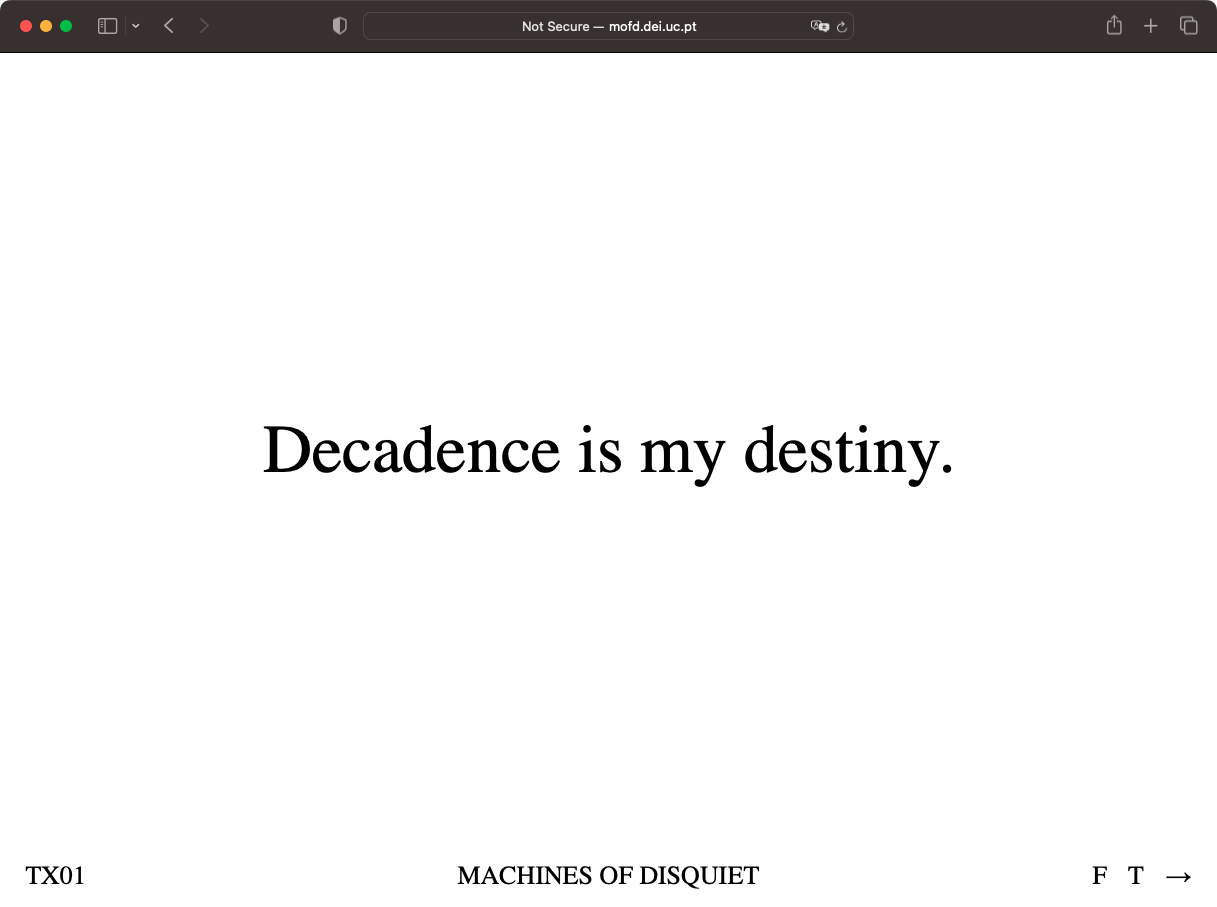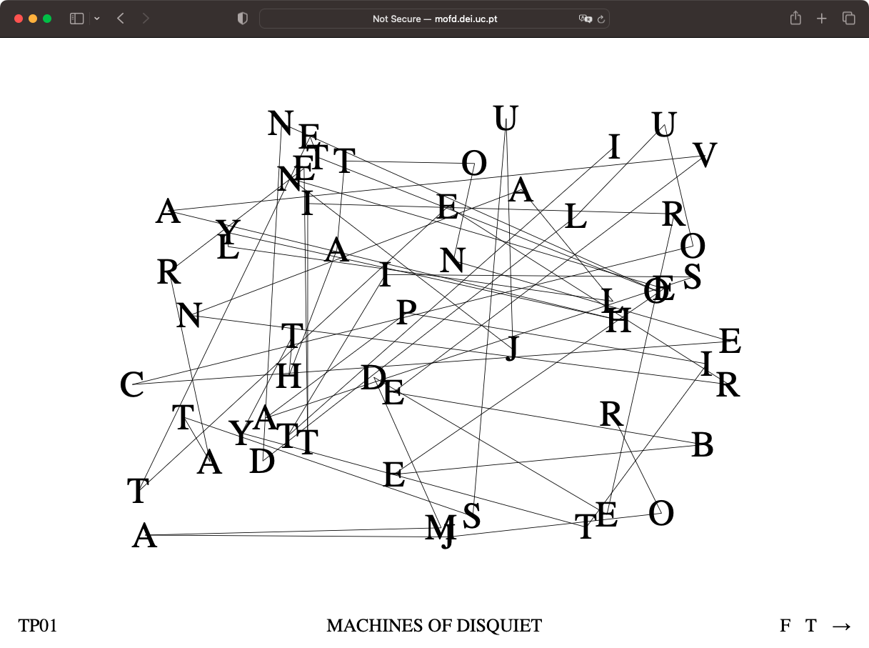As Máquinas do Desassossego são uma série de experiências interactivas com a manipulação de materialidades mediais e formas textuais que exploram o jogo livre dos significantes. Usam o Livro do Desassossego como base textual modular para desenvolverem uma série de aplicações baseadas em multimodalidades (texto, imagem, som, animação) e interações digitais recorrendo a permutações programadas em diferentes escalas (da letra à palavra e à frase).