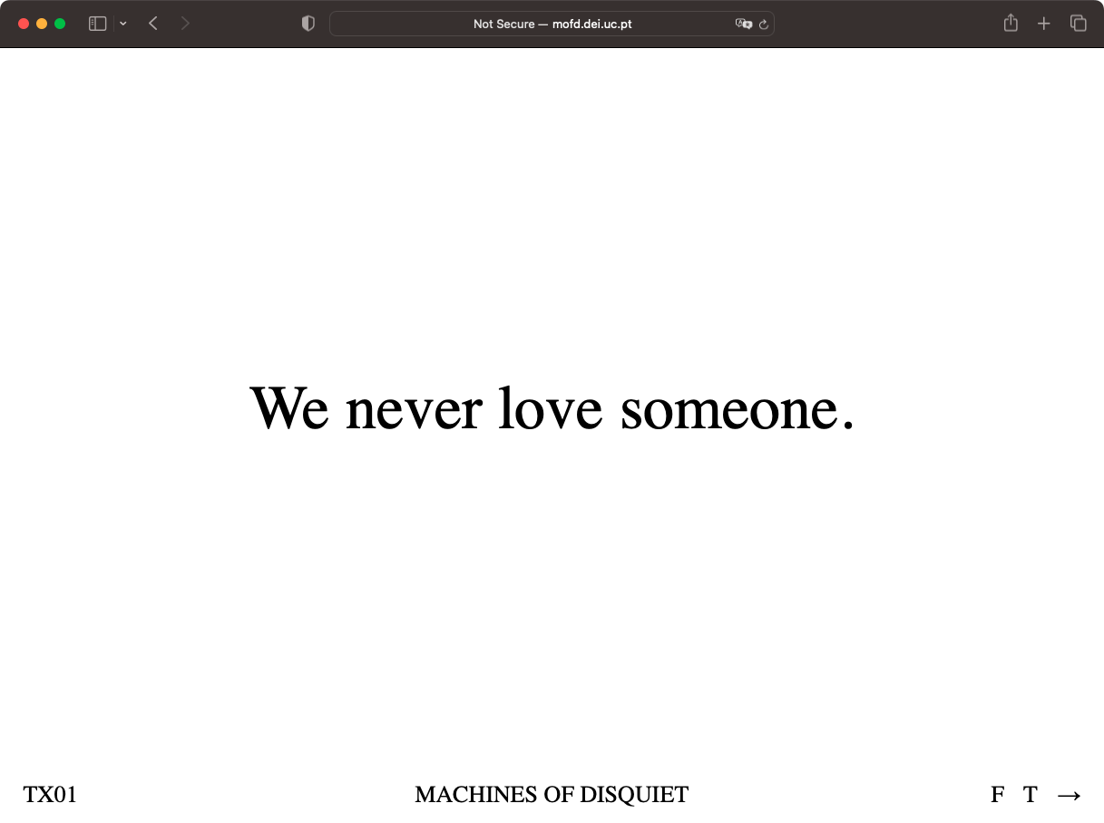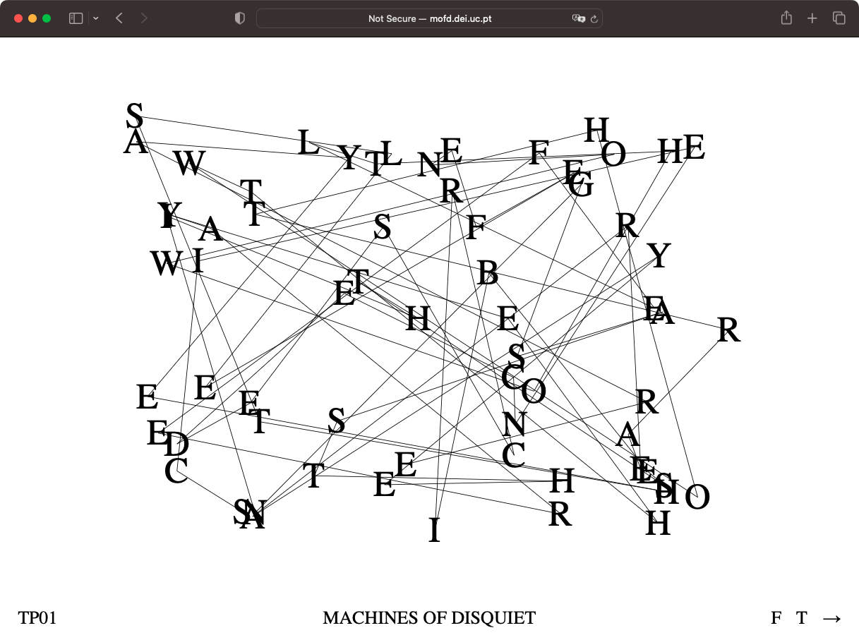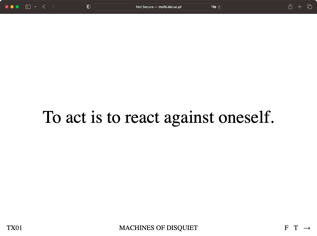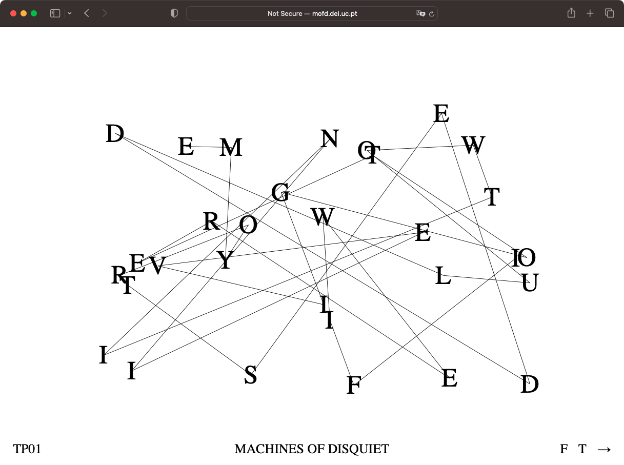 As Máquinas do Desassossego são uma série de experiências interactivas com a manipulação de materialidades mediais e formas textuais que exploram o jogo livre dos significantes. Usam o Livro do Desassossego como base textual modular para desenvolverem uma série de aplicações baseadas em multimodalidades (texto, imagem, som, animação) e interações digitais recorrendo a permutações programadas em diferentes escalas (da letra à palavra e à frase).
